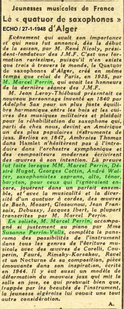 séance des J.M.F. M. Jean Leroy-Thiébaud présentait ce nouveau personnage inventé en 1840 par Adolphe Saz pour un plus juste équilibre harmonique entre les bois et les cuivres des musiques militaires et plaidait pour la réhabilitation du saxophone qui, parti de chez nous, devint en Amérique un des plus populaires instruments de jazz. Berlioz en 1847, Ambroise Thomas dans Hamlet n'hésitèrent pas à l'introduire dans l'orchestre symphonique et des compositeurs modernes écrivirent des oeuvres à son intention. Là preuve fut faite lorsque MM. Marcel Perrin, Désiré Hugot, Georges Cottin, André Walter, saxophonistes soprano, alto, ténor, baryton, pour ceux qui l'ignoraient encore, jouèrent dans un parfait ensemble, et avec la musicalité et la diversité d'un quatuor à cordes, des uvres de Bach, Mozart, Glozounow, Jean Fransaix, Debussy, Jacques Ibert, la plupart transcrites par M. Marcel Perrin. En soliste, M. Marcel Perrin, accompagné si justement au piano par Mme Suzanne Perrin-Valls, compléta le panorama des possibilités de l'instrument dans tous les genres de l'écriture musicale avec des oeuvres de Corelli, Couperin, Fauré, Rimsky-Korsakov, Ravel et un Nocturne de sa composition, pièce émouvante dans son inspiration, écrite en 1944. 11 y eut aussi un modèle de déformation du mauvais jazz qui mit la salle en joie, ce qui prouvait bien que, frappée par les beautés de l'instrument, la jeunesse algéroise lui vouait une tout autre considération. ( tout l'article) |