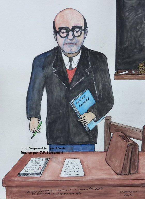 : ...« ...Maintenant à 83 piges j'essaye de faire des caricatures de profs de mémoire.celle que je vous envoie aujourd'hui est celle de monsieur LECOMTE prof de français que j'ai eu en seconde 1943-1944 (rue du Soudan où Gautier occupé par les américains avait été transféré ) et plus tard en 1ère moderne à Bugeaud .[...] j'ai le plaisir de vous l'envoyer souhaitant qu'il rappelle de bons souvenirs à des "viocs" comme moi |